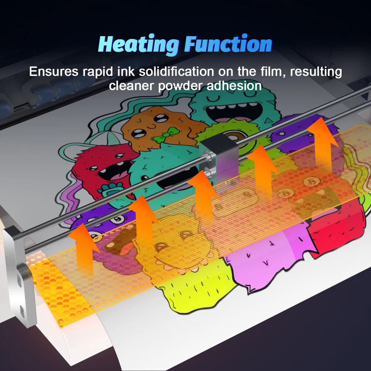 Heating FunctionHelps to solidify the ink on the transfer film Shake the powder more cleanlyMulti-function touch screen display Cleaning Nozzle check Switch
