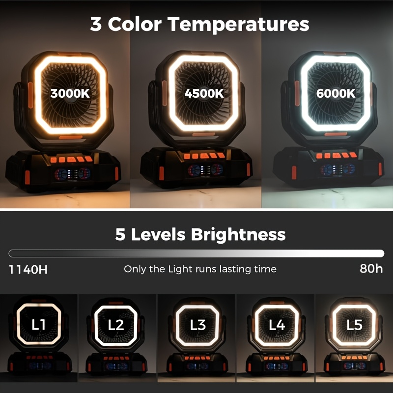 40000mAh BATTERY POWERER FAN WITH LIGHT - This camping fan is a fan, light and 40000mAh battery all in one! The rechargable portable fan with hook and folded handle features 4 Wind Speeds, 3 Color Temps, Adjustable Brightness, Auto-Oscillating, Timer Setting, Remote/Panel Control and Night Mode. It is an ideal portable fan for camping trips, picnic, hiking, fishing, RV trips, beach, forklift truck working, indoor use, power outages, etc. Product Size: 10.6"L x 5.5"W x 13"H